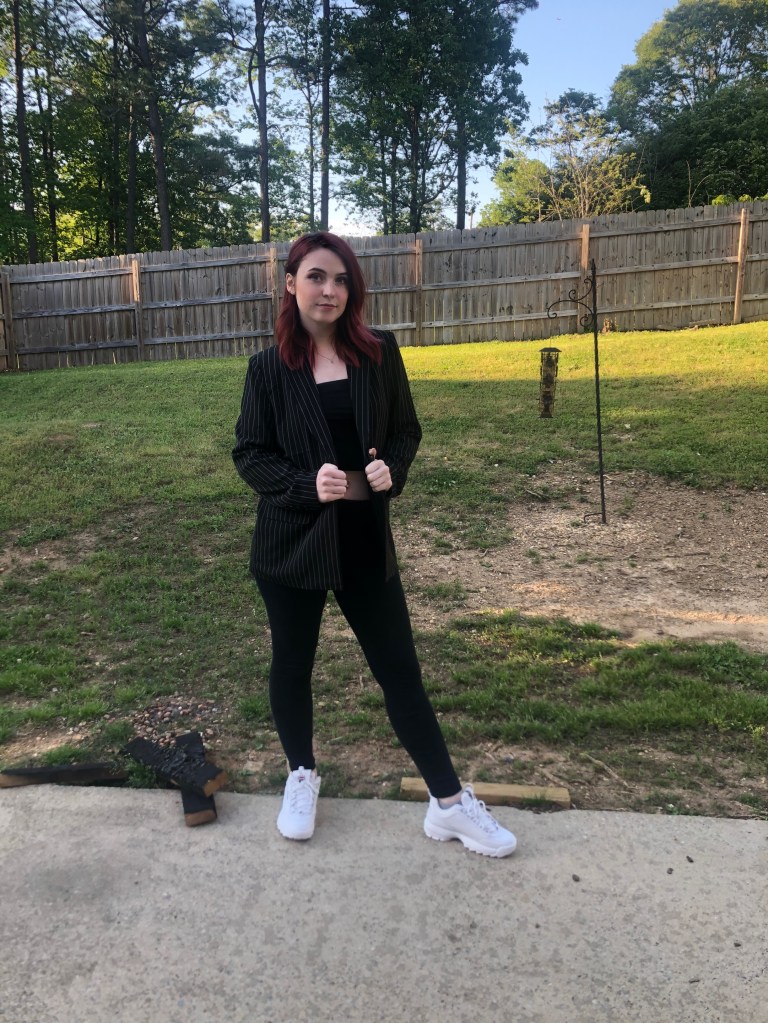 What to do on a random day in quarantine? What helps me feel a lot better is dressing up and expressing how I feel through clothing. So I decided to wear all black, because who doesn’t love black? It was a chilly day so I paired regular black leggings with a plain black tube top and an oversized pin striped blazer. To make the outfit more casual, I added my all white FILA shoes.