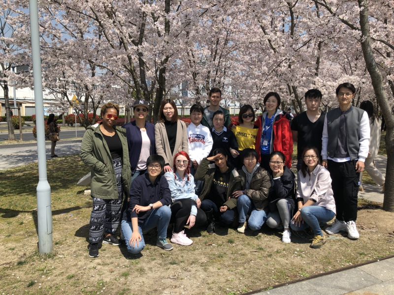 all the teachers walking to look at the newly bloomed cherry blossoms