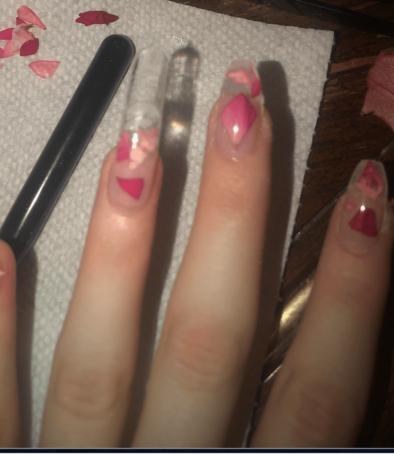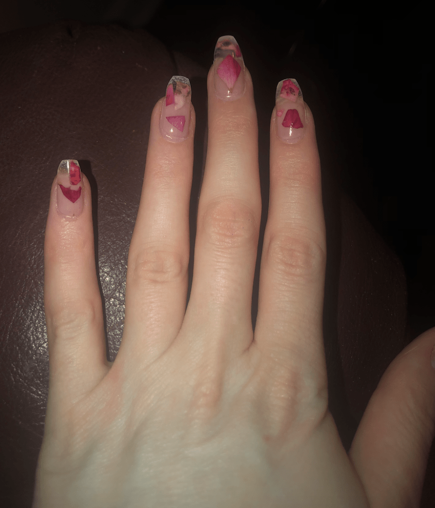 I found a cool idea to put dried flowers inside the gel, so I stole some of my sisters roses and cut them to fit the nail. It doesn’t quite look like petals or flowers, but it turned out to be a very cute look for spring time!